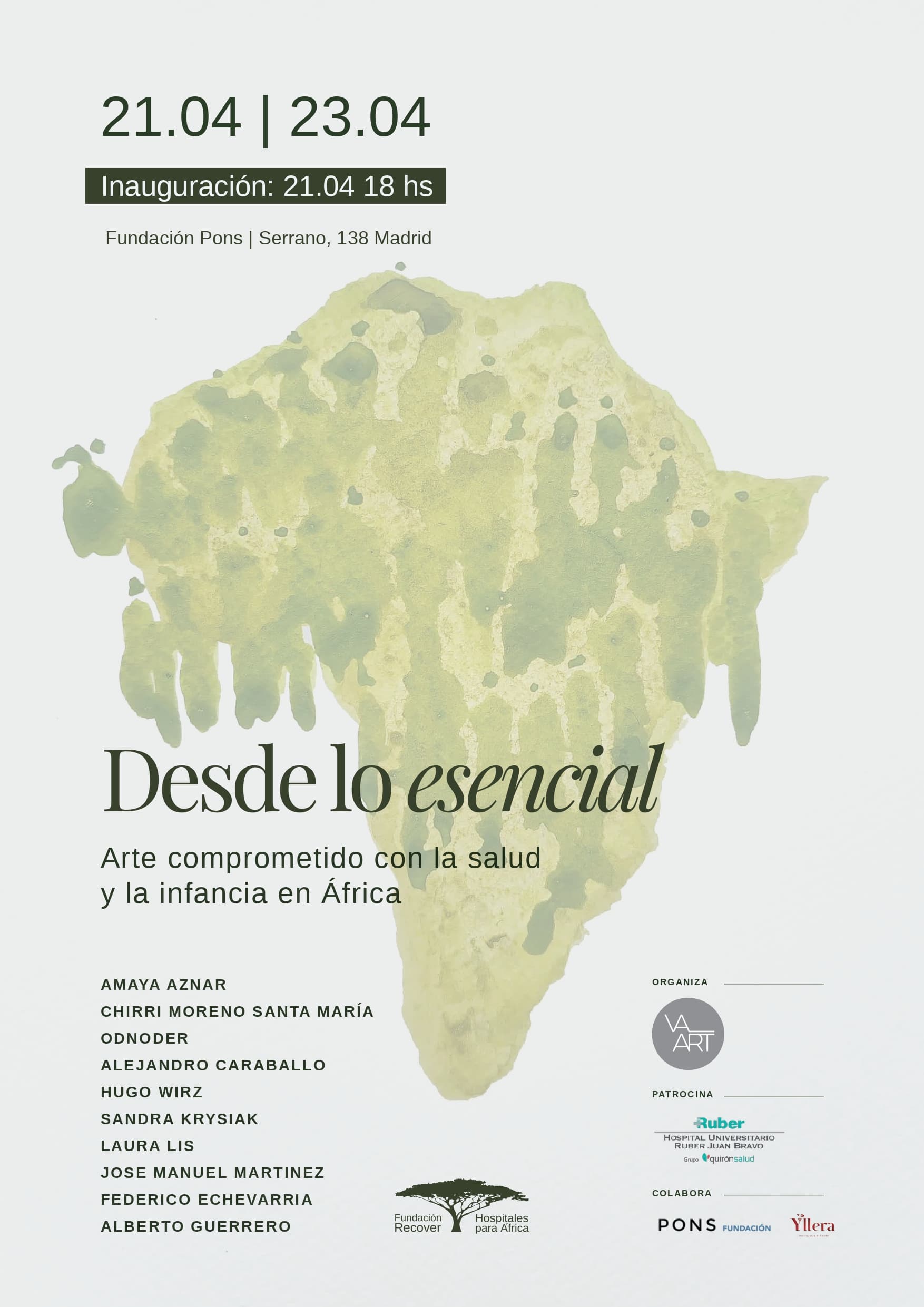 Fundación Recover organiza por segundo año consecutivo la exposición solidaria “Desde lo esencial”, una muestra de arte comprometido con la salud y la infancia en África que se celebrará del 21 al 23 de abril en la Fundación PONS (Madrid).
